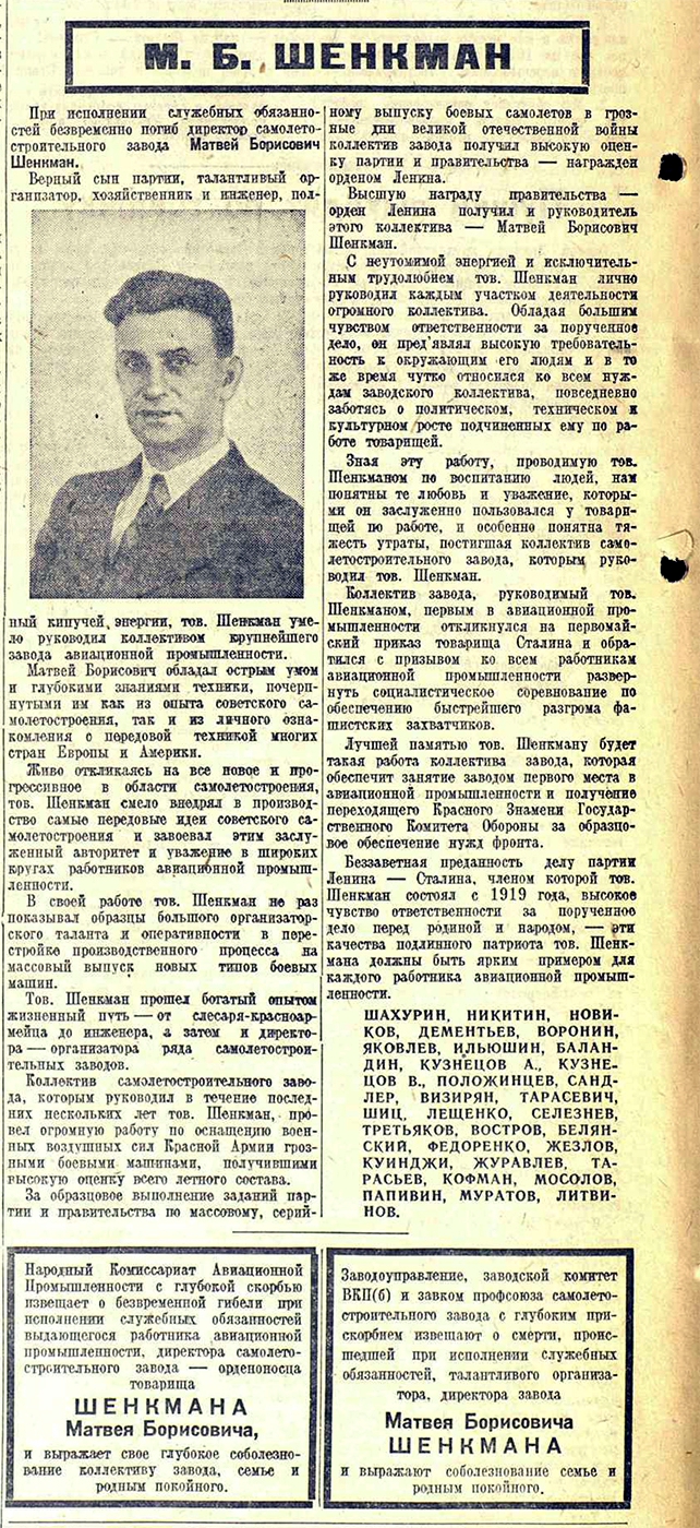 Матвей (Мордух) Борисович Шенкман появился на свет в городе Овруч Житомирской области Украины в семье ремесленника. Обучался в одном из училищ, но грянула революция, а потом – Гражданская война, и он вступил добровольцем в Красную Армию. Воевал. После, как проявивший интерес к технике и большую, в этой области, сообразительность, был направлен командованием в броневую автошколу, а далее – в Ленинградский технологический институт. После обучения, трудился на разных предприятиях, география которых была, поистине, обширна: Ленинград, Подольск, Таганрог, Воронеж, Куйбышев. Начинал с должности инженера-конструктора, поработал мастером цеха, но уже вскоре его выдвинули в начальники производства, и это было очень важно – прийти руководить, что называется, от станка. О высокой репутации Шенкмана может свидетельствовать тот факт, что его включали в состав делегаций, командировавшихся за границу для закупки импортного оборудования и последующей его наладки в Советском Союзе. С этой миссией Матвей успешно справлялся. Его не поглотила волна предвоенных сталинских репрессий, когда многие руководители высшего и среднего звена, чьи заслуги перед страной были несомненны и значительны, объявлялись «вредителями на производстве», «врагами народа», со всеми вытекавшими отсюда последствиями. В 1938 году Матвея Шенкмана назначили директором Воронежского авиационного завода №18. Ходила молва – о том, что в те страшные годы Шенкман, якобы, получил в Кремле заверение: сотрудники НКВД не будут находиться на территории этого предприятия, что предотвратит истребление инженерно-технического персонала. И если это – правда, хотя и верится в такое с трудом, то сей факт красноречиво говорит об особой важности задач, поставленных правительством перед авиазаводом, и о кредите доверия, выданном директору.