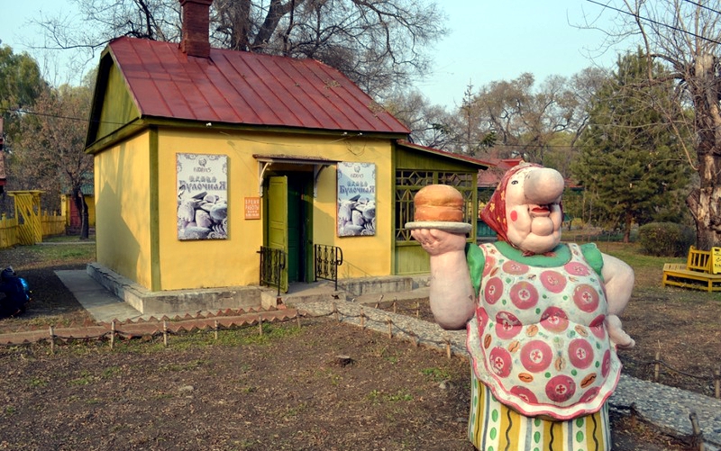 По улице бродят две русские тетки в сарафанах и кокошниках – китайские туристы фотографируются рядом с ними за деньги. Там и тут стоят ростовые скульптуры русских мужиков и баб в стиле дымковской игрушки. Самая выдающаяся скульптура – баба с огромным носом-картошкой, держащая на блюде каравай. Шарж на русский женский образ. Китайцы, фотографируясь, непременно держат эту бабу за ее карикатурный нос.