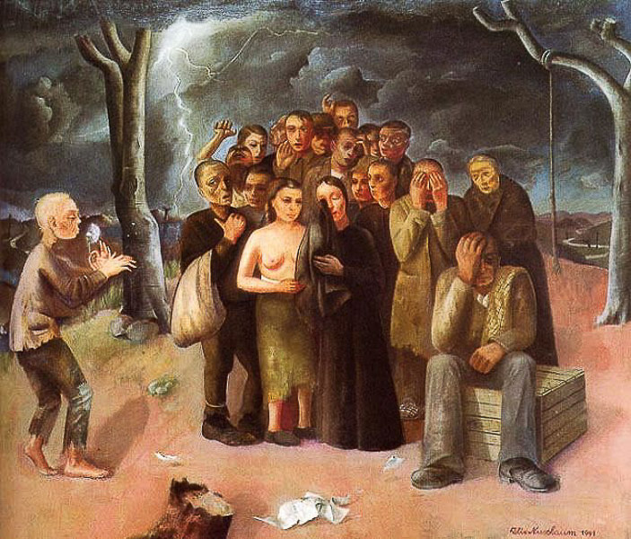 В Бельгии Феликса и Фелку застало начало Второй Мировой войны. Если в Германии они считались преследуемыми евреями, то в Бельгии их статус определялся теперь как «враждебные и нежелательные иностранцы». Последствия, при этом, были только делом времени. А оно работало не на вынужденных переселенцев. Из возможностей противостояния надвигавшемуся мраку у Нуссбаума оставалось одна – творчество, которому он отдался всецело, и глубоко, как никогда, проникся чувством принадлежности к многострадальному и преследуемому народу, от которого многие творческие люди еврейского происхождения тщетно пытались отстраниться. Но еврей – это не национальность, это – судьба. А от судьбы не уйдешь… 8 мая 1940 года немецкие войска вторглись в Бельгию, и уже через два дня Нуссбаум был арестован, как «подданный Рейха, способный носить оружие». Эта формулировка была равнозначна обвинению в дезертирстве. Заколоченный наглухо вагон с арестантами был отправлен во Францию, в лагерь для интернированных лиц, где Нуссбаума принудили подписать документ, подтверждающий его согласие вернуться в Германию. Это было равносильно тому, что человек добровольно подписывает себе смертный приговор. Оставалась надежда – бежать по дороге с поезда. И это Феликсу удалось во время остановки состава в Бордо. Неведомо как Нуссбаум добрался до Брюсселя, где его днем и ночью ждала Фелка. Но что было делать дальше? Законы оккупационного режима затягивали шею каждого из еврейских жителей Бельгии удавкой. Но даже в таких условиях, Нуссбаум продолжил рисовать картины, создав, в частности, «Страх» и По ним можно с точностью определить душевное состояние художника, прочесть те мысли, которые не покидали его и понять чувства, которые он испытывал, работая над этими полотнами.