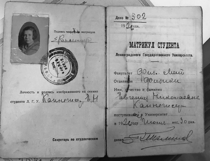 Кошмары гражданской войны и военного коммунизма сменились нэповской экономической вольницей, которая пришлась на годы студенчества в Ленинградском государственном университете для Жени Каннегисер. Она оказалась там в компании молодых физиков, вошедшей в историю под названием Джаз-банд. Было много ученых дискуссий, веселья, рукописный журнал, маскарады. Главной научной звездой там был Лев Ландау, но и другие были, как говорится, не робкого десятка. Забавно встретились Женя и Матвей Бронштейн. В солнечный весенний день после дождя Женя, выйдя из лаборатории, в которой она работала, на улицу, увидела спешившего навстречу маленького роста юношу в очках и распахнутой куртке. Неожиданно для себя она сказала ему: «Свежим ветром снова сердце пьяно». И к ее радости услышала в ответ продолжение: