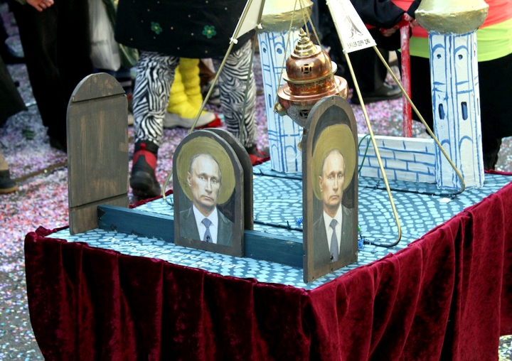 А почему Нижний Новгород должен быть исключением, озадачились в разных частях «русского мира». В Калининградском аэропорту за 10 долларов продают свою икону Путина с нимбом в цветах российского флага. В ЛНР, в оккупированном Алчевске, тоже изобрели икону Путина. Публицист Юлия Латынина рассказывает: «На выставке в тульской детской библиотеке висит картина, вы не поверите, там не только президент Владимир Путин, но даже и премьер-министр Медведев. Путин – в золотых доспехах, в колеснице, от него исходит божественное сияние, в компании с Богородицей».