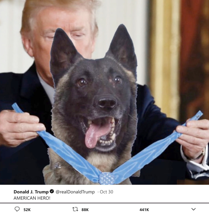 Не успели отшуметь страсти по поводу рейда, как Трамп разместил в Твиттере фото собаки. “Мы рассекретили фотографию замечательной собаки (кличку не рассекретили), которая проделала ОТЛИЧНУЮ РАБОТУ при захвате и убийстве лидера ИГИЛ Абу Бакра Аль-Багдади”, – написал он там же.