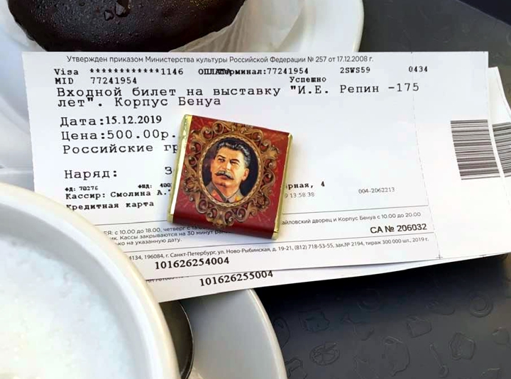 Ох-обалдел означает, что к кофе в кафе «Михайловский» корпуса Бенуа полагалась плитка шоколада с изображением Сталина. Сталин – часть шоколадного проекта «Лица России» создавалась на основе массовых опросов, согласно которым чудесный грузин, по выражению Ленина, опередил в рейтинге Ленина.