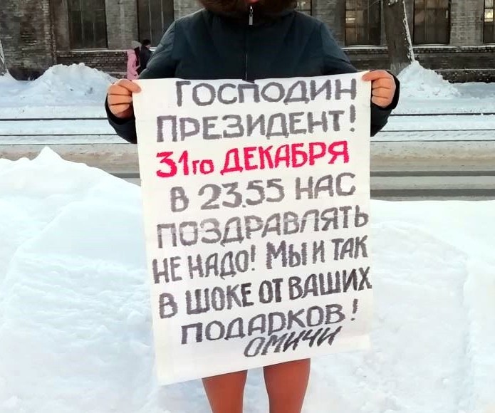 Новогодний подарок от Путина – внесение части регионов Урала и Сибири, «которые раньше не подпадали под эту меру поддержки при рождении детей». Хорошо вроде бы. Но уж больно гладко говорит гарант. Вот в Омске народ и задумался – что стоит за таким обещанием? С Кремлем ведь известно как: коли речи медовые, за ними будни бедовые. А кто-то не выдержал, вышел с плакатом. «Господин президент! 31-го декабря в 23.55 нас поздравлять не надо. Мы и так в шоке от Ваших подарков. Омичи».