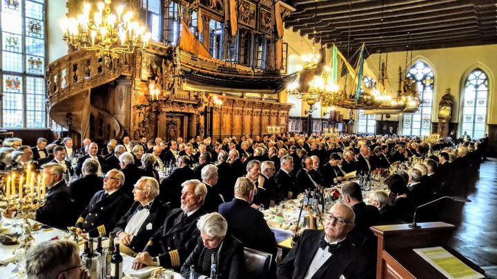 Именно они дают сигнал к началу трапезы. Сначала раздается звон корабельного колокола. Происходит это в 14:00. И зазывают собравшихся кличем, какой бытовал ещё полтысячи лет назад. А было принято у бременских коков, говорящих на нижненемецком диалекте: «Essen fassen, Essen fassen unter Deck und an Deck, unter Deck und an Deck Essen fassen!» (Хватай обед, хватай обед на палубе и в трюме). Ну такой вот зов. Хотя понятно: хватать в просторном Верхнем зале Бременского городского совета ни к чему: наготовлено всего вдоволь, трапеза рассчитана на пять часов. Ешь не хочу. Народ не просто культурный – изысканный. Зал рассчитан не более, чем на 100 особ, каждая из которых внесла значительный вклад в развитие не только ловли рыбы, но и экономических связей и укрепления государства.