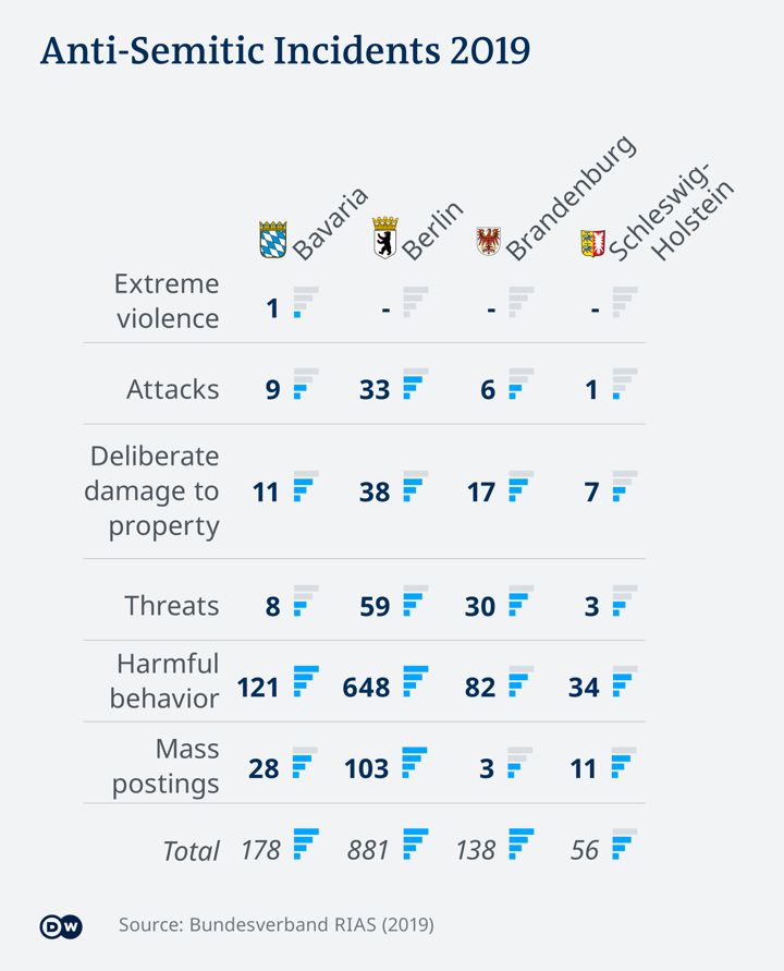 Этот теракт оказался у всех на слуху и серьезно усилил ощущение опасности у живущих в Германии евреев, однако общая ситуация в стране также не располагает к оптимизму: по данным RIAS, в течении 2019 года проявления антисемитизма росли и множились. Центр RIAS является информационным, к нему могут обратиться люди, пострадавшие от антисемитских нападений, но он – не полиция, от преступлений не защищает. Он лишь ведет статистику и делает выводы. В начале мая этого года RIAS впервые опубликовал отчеты не только своего берлинского отделения, но и недавно созданных отделений в других федеральных землях – Бранденбурге, Шлезвиг-Голштейне и Баварии.