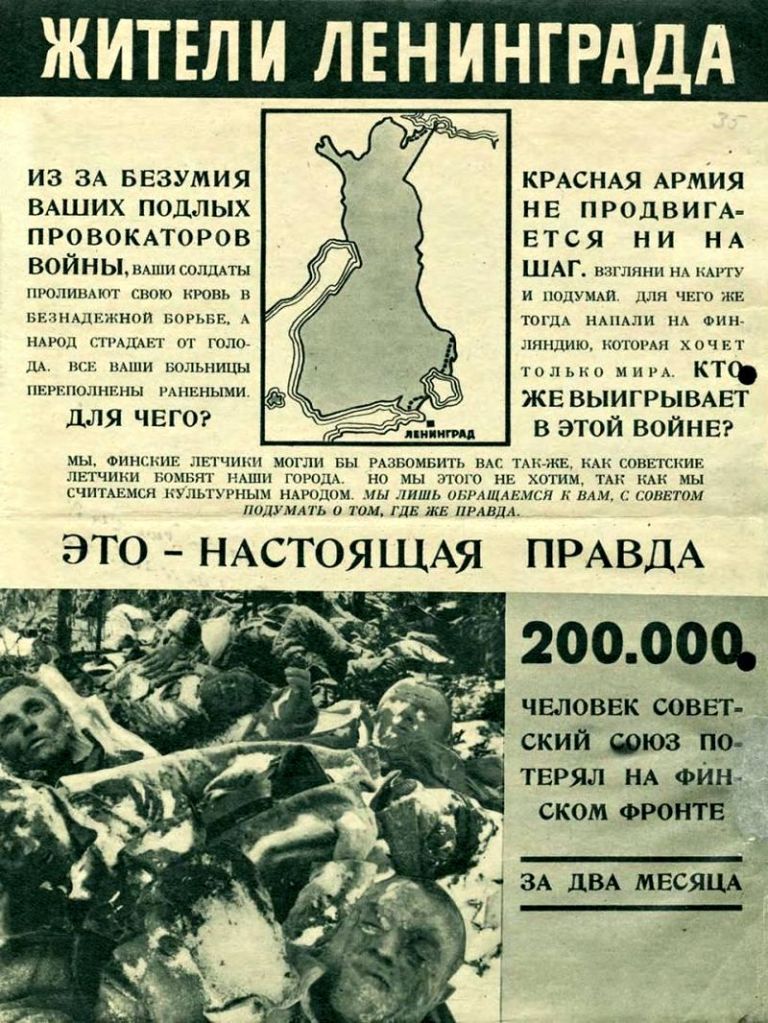 Ой, ли! Да только не собирались финны нападать на Ленинград, население которого 3 191 304 по данным на 1939 год приближалось к численности населения всей Финляндии, составлявшее в то время 3 млн. 699 тыс. 700 граждан. Зачем им столько русских?