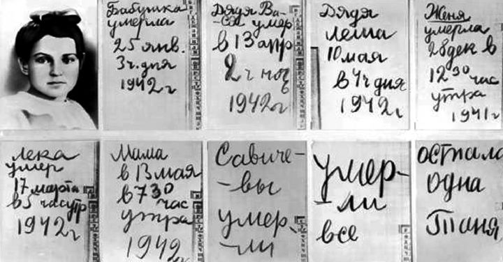 Таня Савичева, одногодка моей мамы, вела записи в блокадном городе. Сил хватало только написать, когда погибли её бабушка, два дяди, мама, брат и сестра. Во время эвакуации сироту вывезли по «Дороге жизни» на Большую землю в посёлок Шатки, где Таня умерла от истощения.