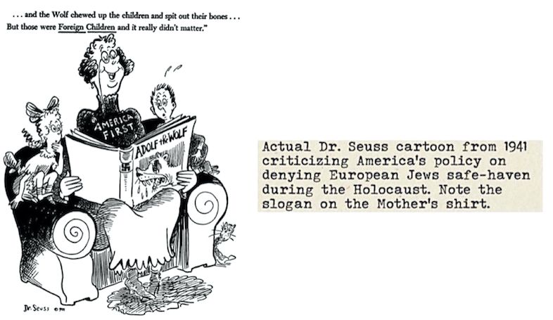 Между тем Арт Спигельман, автор предисловия к вышедшей в 1999 году книге Ричарда Минира Dr. Seuss Goes to War, написал, что политические карикатуры Доктора Сьюза «выступают против изоляционизма, расизма и антисемитизма с убежденностью и страстью, отсутствующих в большинстве американских передовиц того периода». Более того, это были «по сути единственные газетные карикатуры, не считая коммунистической и негритянской прессы, которые осуждали [расистскую] политику Джима Кроу в армии и антисемитизм [знаменитого летчика] Чарльза Линдберга».