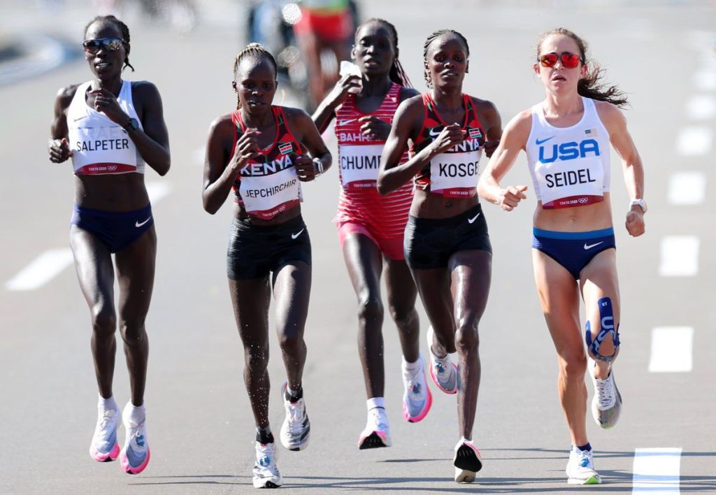 Она весь путь провела в группе лидеров, был момент, когда она бежала в плотном окружении 4-х африканок, традиционных специалисток по марафону. Но она все выдержала. Раньше американок в этом виде спорта никогда среди медалисток не было.