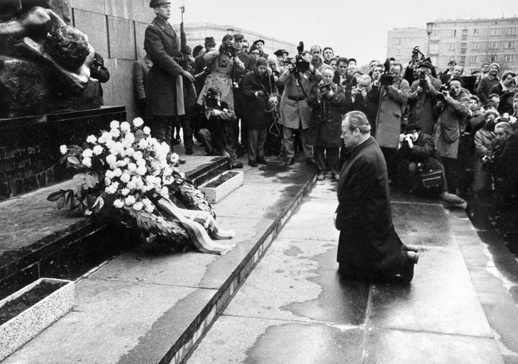 Канцлер германии Вилли Брандт, преклонивший колени перед памятником героям варшавского гетто, созданным Натаном Рапопортом