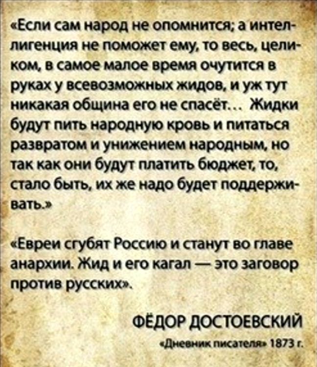 Да-с, Фёдор Михайлович. Вы-с. Вы и убили-с. Вы щедро вспахали и засеяли почву для этого геноцида – своими словами, мыслями, статьями, речами, «преподаванием» в «императорском классе». Именно вы стали идейным вдохновителем этих дремучих, посконных юдоедов, вы дали им базу, инструментарий и моральное оправдание. И если Константин Победоносцев остался в истории с прозвищем «русский Торквемада», то какого же прозвища заслужил «великий писатель, гуманист и зеркало русской души» юбиляр Фёдор Достоевский?