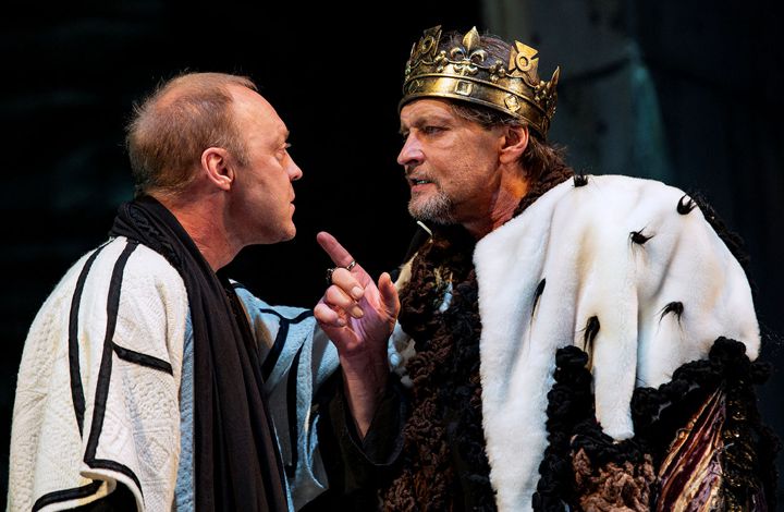Действующий на престоле старший брат Эдуард – больной и слабый, не способный управлять страной. Актер Сергей Виноградов изображает его карикатурный образ слабым голосом, жеманными манерами и смешным нарядом – мантия, скроенная из разнородных кусочков ткани и меха, турецкие тапочки с загнутыми мысами. Все говорит о слабости действующего монарха. Еще один брат – Георг, утративший доверие короля и оболганный, попадает в тюрьму. Ричард добивается того, что король не доверяет брату Георгу, и устраняет малолетних племянников, наследников престола – детей Эдуарда. Затем устраняет и родственников королевы – жены покойного брата. Распуская слухи о том, что принцы были рождены вне брака, Ричард занимает королевский престол. Он готов уничтожить любого, кто встанет на его пути к короне. Природа наделила Ричарда внутренней силой и талантом политика. Живя в эпоху международных распрей, попав в эту стихию, он быстро уловил все тонкости придворных интриг. Драматична сцена объяснения Ричарда с своей матерью – герцогиней Йоркской, которую играет Ольга Остроумова. Понимая все совершенные им ужасные злодеяния, и проклиная его за это, она остается матерью, любящей и нежной. Она осуждает время раздора, когда победители, одолев врага, вступают в распри друг с другом: “на брата брат, и кровь на кровь родную”.