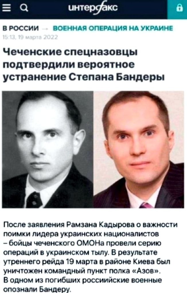 Об украинских националистах в России вообще знают крайне мало – само это понятие используется исключительно в качестве некоего клише, синонима слова «враг». Вроде как революционная матросня в 1917 изливала свою ненависть к непонятным «кадетам», не особо вникая, кто они такие – то ли члены партии конституционных демократов, а то ли ученики начальных классов военных училищ (возрастом до 12 лет). Так и теперь: «украинский националист» – это некий собирательный образ предателя-фашиста-нациста-бEндеровца, который следует ненавидеть и который, безусловно, подлежит уничтожению, лучше всего – массовому. Идиотизм доходит до того, что «великий русский учёный Рамзан Кадыров» на полном серьёзе объявил награду в пять миллионов рублей за голову главного украинского националиста… Степана Андрийовича Бандеры. Хуже того: его верные абреки успели доложить, что «прихватили» помянутого Степана Андрийовича в главном штабе укронацистов, с приложением фотографии… известного украинского журналиста Юрия Бутусова, и в самом деле немного похожего на убитого в октябре 1959 года в Мюнхене лидера Организации украинских националистов (ОУН), бывшего узника нацистского концлагеря Аушвиц (Освенцим), С. А. Бандеру…