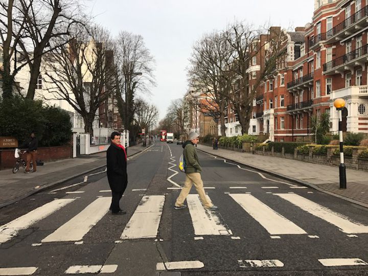 На Эббей Роуд (Abbey Rd.) мы поехали, потому что там и сегодня располагается знаменитая студия звукозаписи одноименного названия, где Битлзы записали свой двенадцатый студийный альбом – последний совместный проект всех четырёх участников ансамбля. На обложке помещена фотография группы, идущей по пешеходному переходу. Вот они идут: впереди Леннон, ”весь в белом”, за ним следуют Старр, Маккартни и Харрисон. Маккартни шагает босиком и не в ногу с остальными, держа в правой руке сигарету.