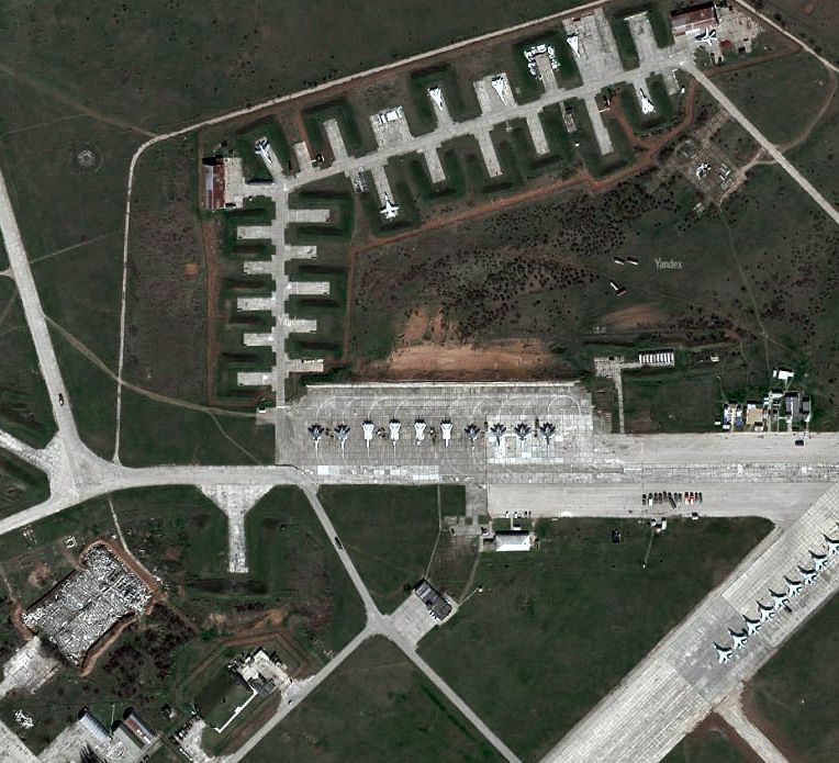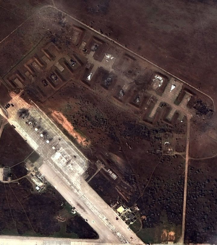 В иных условиях подобный аэродром считался бы весьма уязвимым: он ведь полевой, железобетонных защитных ангаров там нет, самолёты стоят просто в поле в земляных нишах. Это поможет справиться с локальным пожаром, но не убережёт (точнее сказать – не уберегло, ибо уже) от разлёта обломков и большой детонации. Плюс эти самые склады бомб… Однако же, не будем забывать: Крым – «неприступная крепость», вокруг – куча С-300, С-400 и даже С-500… да что там! Есть даже С-600 – личный шестисотый «мерседес» командира полка. Ну, и «Панцири», «Буки», «Торы»… Чего бояться?