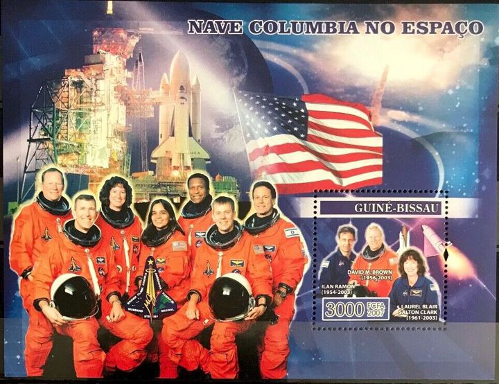 В 2007 году блок марок, в память о трагическом финале полета «Колумбии», выпустило также африканское государство Гвинея-Бисау, где половину населения составляют мусульмане. В отличие от Сомали, с этой страной Израиль, еще с 1994 года поддерживает дипломатические отношения. Слева на блоке можно увидеть состав погибшего экипажа космического челнока – на фоне стартовой площадки космодрома, откуда производился его запуск. А в правой части, в виде отдельной, встроенной в блок марки, его авторы выделили трех, не вернувшихся на землю астронавтов – Илана Рамона, и рядом с ним – пилота Дэвида Макдауэлла Брауна и научного специалиста, женщину-астронавтаЛорел Блэр Сэлтон Кларк.