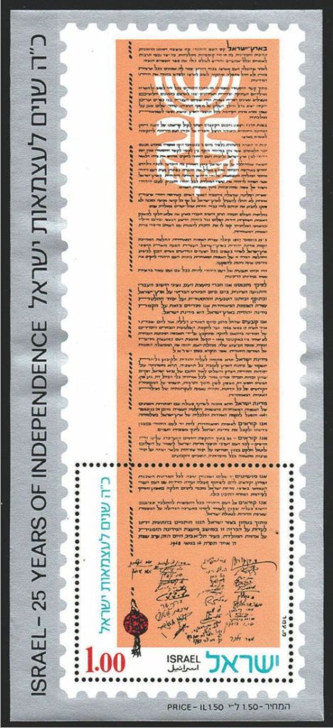 На четверть века раньше, к 25-летию Израиля, появилась специальная марка с полным текстом Декларации Независимости, подписями под нею и сургучной печатью. «Уповая на Твердыню Израиля, мы скрепляем нашими подписями сказанное в настоящей Декларации…» – говорится в заключительном абзаце документа, провозгласившего не только о создании еврейской страны (а если точнее – о воссоздании ее на исторической родине еврейского народа), но также излагающего основные принципы устройства Государства Израиль, его внутренней и внешней политики.