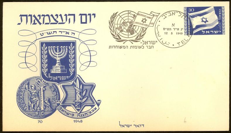 Но вернемся к первым годам в биографии Израиля. В первую годовщину обретения суверенитета, в Тель-Авиве было осуществлено гашение памятного конверта с надписями «День Независимости» и «Израиль – член Организации Объединенных Наций». Кроме государственной символики, на конверте этом изображен отличительный знак Армии Обороны Израиля, а также оборотная сторона монеты, известной, как «Judaea Capta» – «Плененная Иудея». Выпуском этой монеты Римский сенат увековечил разрушение Иерусалима в 70 г. н. э. Монета превратилась в символ, знаменующий конец древней еврейской независимости, начало изгнания и жизни еврейского народа в рассеянии. Аллегорический образ «Плененной Иудеи» или «Дочери Сиона» стал одним из центральных мотивов в еврейской поэзии 19 века. А в начале 20 века «Плененная дочь Сиона» из символа унижения и разрушения превратилась в «Освобожденную дочь Сиона» – символизируя борьбу народа за воплощение идей политического сионизма.