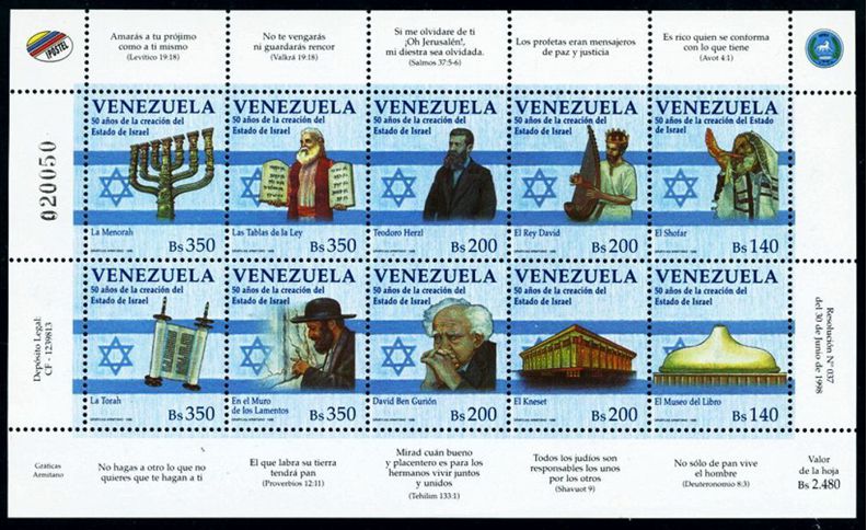 Красочный блок выпустила к 50 годовщине провозглашения государственной Независимости Израиля Венесуэла – страна на севере Южной Америки (не ошибусь, предположив, что официальное название этого государства известно не каждому – Боливарианская Республика Венесуэла). На 10 марках на фоне израильского флага изображены атрибуты иудаизма – скрижали с заповедями, свиток Торы, менора, шофар и сюжет «У Стены Плача». Далее, вразброску, без хронологической последовательности, размещены портреты важных фигур в еврейской истории: Царя Давида, Теодора Герцля и Давида Бен-Гуриона. И, кроме того, запечатлены здание израильского парламента – Кнессета и Храма Книги – отдела Музея Израиля в Иерусалиме, где хранятся Кумранские свитки Мертвого моря – древнейшие в мире рукописи Святого Писания. А еще на почтовом блоке приведены цитаты из этой сокровищницы мудрости: «Возлюби ближнего твоего, как самого себя», «Пророки были вестниками мира и справедливости», «Все евреи ответственны друг перед другом» (ибо все иудеи в ответе друг за друга перед Небесами), «Не мстите, и не держите обиды». И далее – «Кто возделывает свою землю, тот будет насыщаться хлебом» (но это – только первая часть поучения, а продолжение таково: «… а гоняющийся за пустыми мечтами насытится нищетой»), «Как хорошо и приятно братьям жить вместе» (и это изречение имеет продолжение), «Не хлебом единым жив человек», «Тот богат, кто довольствуется тем, что имеет». И еще: «Если я забуду тебя, Иерусалим, пусть отсохнет десница моя». Помните продолжение? – «Да прилипнет язык мой к нёбу моему, если не буду помнить тебя, если не вознесу Иерусалим на вершину веселья моего». Таким образом, почтовые миниатюры могут приобщать людей к вековому духовному наследию, в данном случае, – еврейского народа. Стоит отметить: почтовый блок, подробно описанный нами, появился в ту пору, когда между Венесуэлой и Израилем существовали дипломатические отношения, установленные еще в 1949 году. Однако, в период правления в Венесуэле Уго Чавеса, Венесуэла резко осудила действия израильской армии во Второй ливанской войне, назвав их «антиарабским Холокостом» и отозвала своего посла из Тель-Авива. В свою очередь, на родину вернулись из Каракаса глава и сотрудники дипломатической миссии Израиля. В настоящее время еврейская община Венесуэлы насчитывает порядка 9.000 человек – за время правления президента Чавеса и продолжившего его курс Николаса Мадуро, она сократилась втрое.