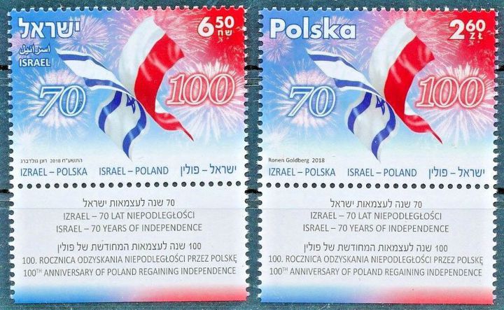 В 2018 году почтовыми службами Израиля и Польши был осуществлен совместный выпуск марки, посвященной 70-летию Израиля и 100-летию Независимости Польши. Следует пояснить: в этой стране празднуется обретение суверенитета после окончания Первой Мировой войны. Торжества и богослужения, связанные с этим событием, прошли в 2018 по всей Польше. На марке с двумя датами – «70» и «100» изображены смещающиеся государственные флаги Израиля и Польши.
