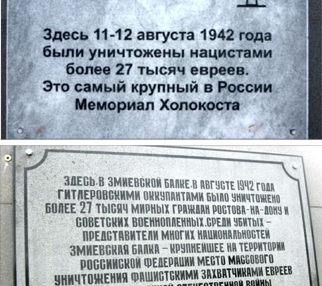 За последние годы официальный российский дискурс всё более эксплуатирует совершенно экзотическую идею о том, что главной жертвой нацистского геноцида был не еврейский, а именно «советский народ» (который, не забываем, у них тождественен с российским). Именно поэтому на памятниках жертвам Шоа меняются тексты, как это случилось в Змиевской Балке: «евреи» на «мирные советские граждане». А в ответ на вопрос – а почему, собственно? – функционеры мило хлопают глазками: а что такое, эти евреи же были советскими гражданами или нет?