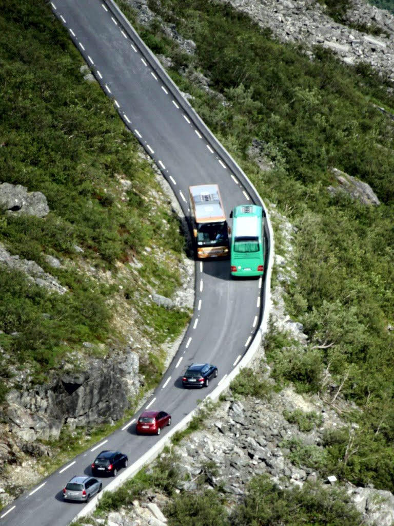 Дальше выехали на снежную дорогу (“Дорогу троллей”) – национальную туристическую дорогу Аурландсфьеллет, которая соединяет через горы, расположенные на разных рукавах, Согнефьорда Лаэрдаль и Аурланд. Дорога Aurlandsfjellet протяженностью в 48 км была проложена в 1967 году вместо горной строительной подъездной дороги. Максимальная высота 1306 м. Дорога открыта для проезда только с 1 июня до 15 октября. До постройки в 2000 году Лаэрдалского туннеля (самого длинного в стране) поездка по ней была единственным способом добраться по суше из Восточной Норвегии в Берген. Ехать нужно было чрезвычайно осторожно. Иногда передняя часть автобуса просто пролетала над обрывом, а водитель вел одной рукой… Да, тут наш Томек показал свой высший класс водителя!