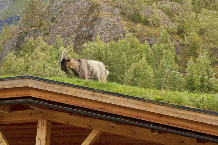 Когда входишь на территорию парка, сразу же бросается в глаза прямо напротив входа строение с зеленой травяной крышей, на которой пасётся коза. Очевидно, как один из символов природной жизни Норвегии.