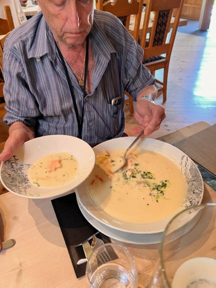 Конечно, такое обилие впечатлений потребовало еще одного – вкусового. Гена предложил нам и это: отобедать в парковом ресторане. Ресторан был отделан в стиле викингов, меню тоже. Оно не было особенно разнообразным, но каждое блюдо было особенным. На первом месте, конечно, оказался рыбный суп. Он был сварен из нескольких сортов местных рыб, но самое главное, там были специи! Очевидно, какие-то специфические местные, они придавали супу необычайный вкус, я даже нe смог его сравнить ни с каким другим.