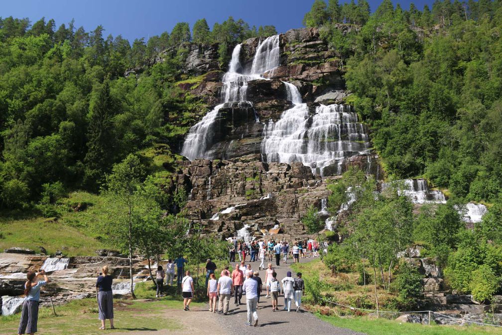 Не успели мы прийти в себя от красоты фиордов, как сначала проехали 8-километровый тоннель, а потом подкатили к шикарному водопаду Твиндефоссен. Ступенчатый водопад Твиндефоссен (Tvindefossen) находится между Хардангерфьордом и Согнефьордом, к северу от городка Восс. Высота падения его воды – 150 м. Вода в нем стекает по многочисленным каменным ступеням-террасам, формируя множество разветвленных небольших водопадов. В зависимости от мощности водного потока водопад приобретает красивую форму свадебного торта. Это один из самых интересных и часто посещаемых водопадов Норвегии. Популярность его связана не только с удобным местоположением у шоссе, но и с легендой о целебных свойствах его воды. Согласно поверью, вода из водопада способна повышать “мужскую силу”. Поэтому туристы не только любуются красотой водопада, но и обязательно набирают целебную воду в дорогу. Правда, поговорить с кем-либо о результатах потребления этой воды не довелось.