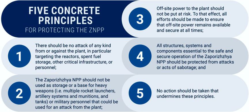 В соответствии с 5 конкретными принципами ядерной безопасности МАГАТЭ США подчеркивают жизненную необходимость избегать любых действий, которые могли бы поставить под угрозу безопасность ЗАЭС.