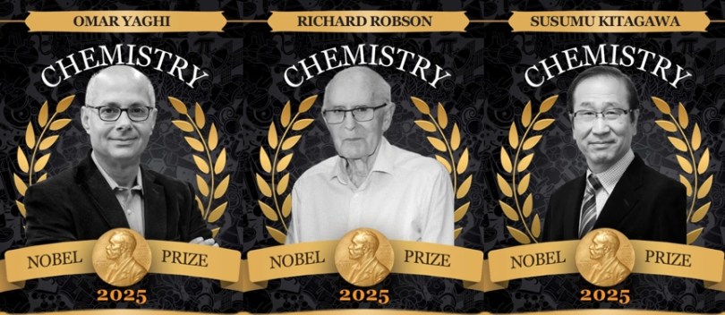 Лауреаты премии по химии: японский ученый Сусуму Китагава, британец Ричард Робсон и иорданец Омар Яги за работу по созданию металлорганических каркасов.