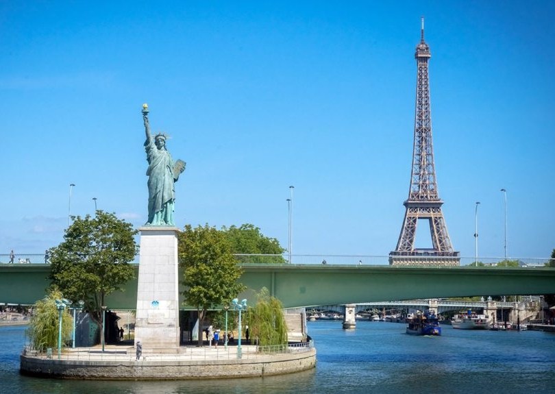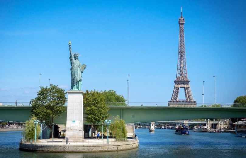 Итак, мы как бы, стоим посередине Сены, а Париж, как бы, плывет перед нами. Вот уже знакомая нам статуя Свободы, вид спереди. Выясняется, что она стоит спиной к Эйфелевой башне.