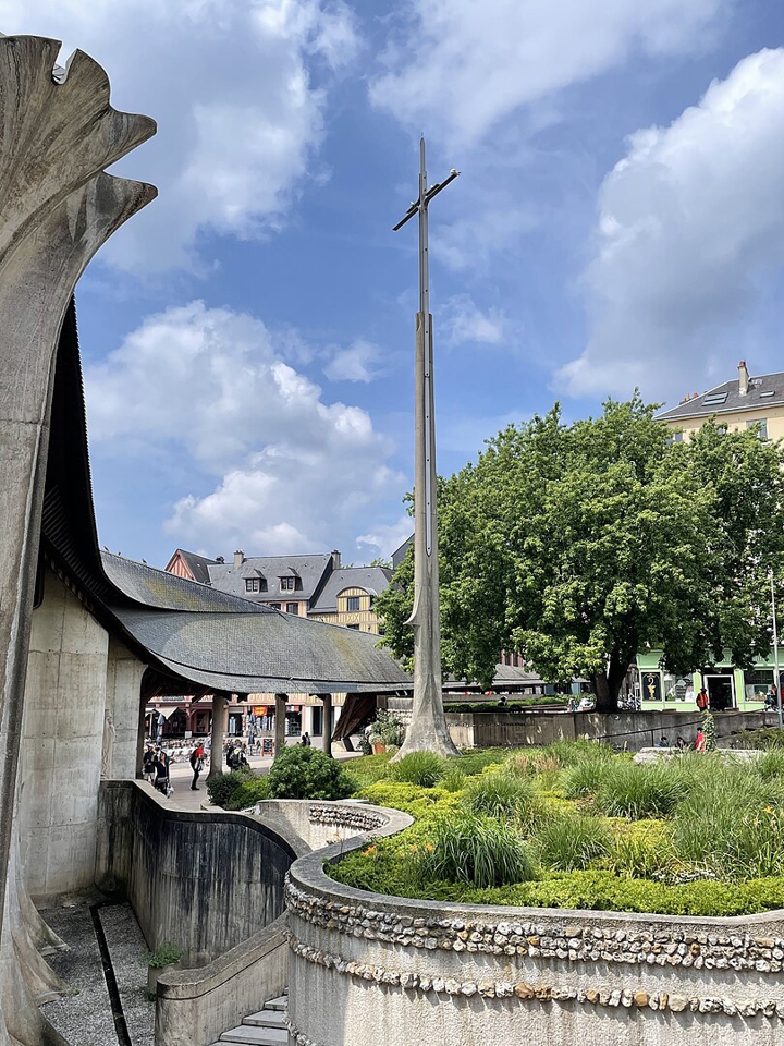 А на Старорыночной площади Руана мы зашли в собор Святой Жанны д’Арк, который был возведен после Второй мировой войны на месте её мученической смерти. Построив это здание, муниципалитет решил три задачи: в городе появилась церковь, посвящённая Жанне д’Арк, это здание также стало гражданским мемориалом национальной героини, а также местом хранения витражей из разрушенной в 1944 г. церкви Сен-Венсан. Вообще-то это большой современный архитектурный комплекс, включающий в себя, кроме собора, также крытый рынок (давший название площади). Церковь необычна снаружи и невероятно красива изнутри. Необычность, выразительность и красоту церкви придают огромные витражные окна и крыша очень сложного криволинейного очертания, поддерживаемая деревяными балками. Крыша собора напоминает костёр, на котором в этом самом месте была казнена Жанна д’Арк. На месте костра поставлен высокий мемориальный крест. Одна из стен новой церкви составлена из сохранившихся старинных витражей собора, стоявшего на этом месте и уничтоженного авиацией союзников во время высадки в Нормандии.