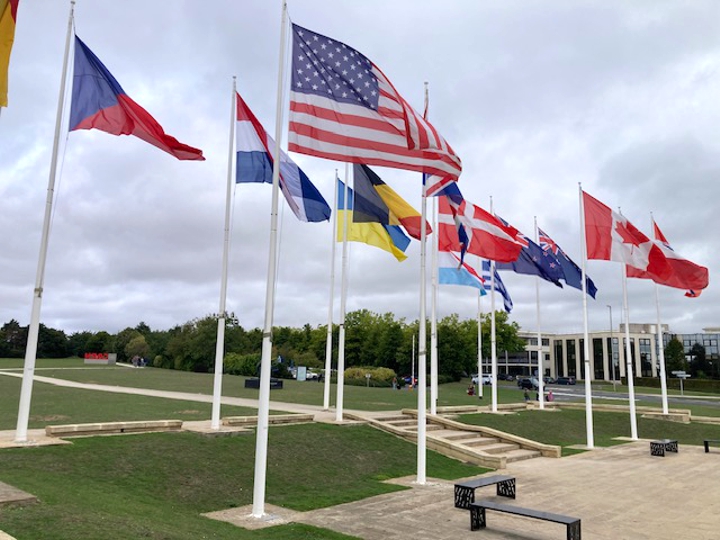 В более широком смысле Мемориал Кана посвящён истории XX века, в основном хрупкости мира. Его цель – “отдать дань уважения городу-мученику освобождения”, а также рассказать “о страшной истории XX века в духе примирения». Мемориал посвящён истории насилия и напряжённых, выдающихся конфликтов XX века, и, в частности, Второй мировой войны. Музей был официально открыт 6 июня 1988 г. (в 44-ю годовщину высадки в Нормандии) президентом Франции Франсуа Миттераном. Перед входом мы увидели флаги основных стран, участвовавших в Нормандской операции. На наше удивление посередине этого парада флагов гордо развевался флаг Украины. На наш вопрос кто-то из сотрудников музея ответил, что это – знак солидарности с воюющей Украиной.