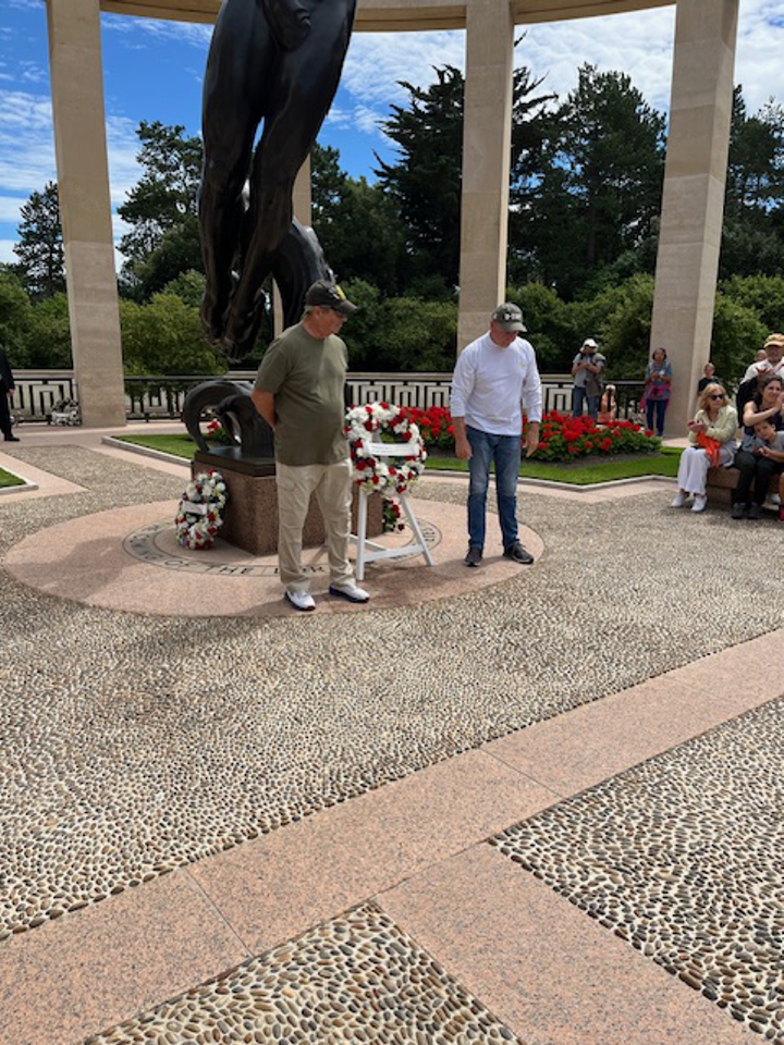 Ориентировочная таблица с видом на пляж описывает высадку в Нормандии. Глядя на запад от мемориала, на переднем плане можно увидеть отражающий бассейн; за ним находится зона захоронения с круглой часовней и в дальнем конце гранитными статуями, представляющими США и Францию.