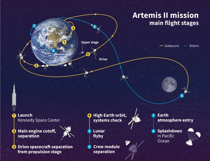 Миссия Artemis II должна установить рекорд дальности полета для человека, удалившись от Земли более чем на 252 000 миль (400 000 километров), после чего совершит разворот за Луной и направится домой, не совершая посадки и не выходя на лунную орбиту. В настоящее время этот рекорд принадлежит миссии «Аполлон-13».